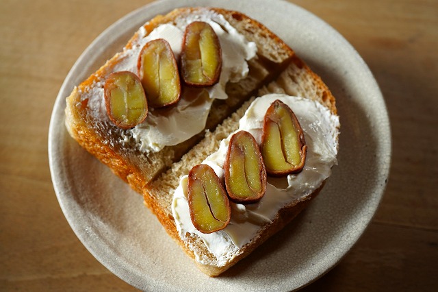 自家製食パンにクリームチーズを塗り、渋皮煮をスライスしてのせる。