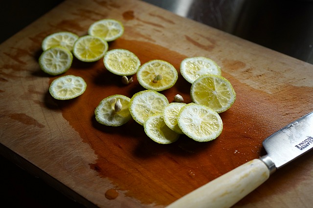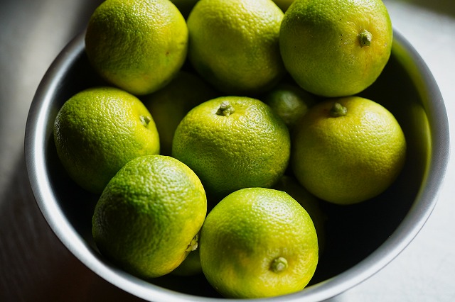 瓶に詰めると、スダチの緑と半透明な氷砂糖がとても素敵なものに見えてくる。