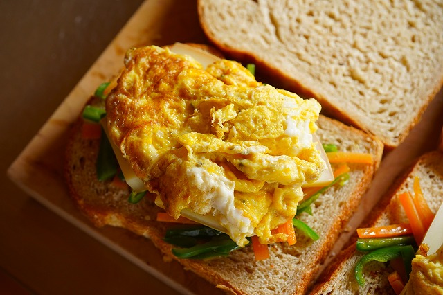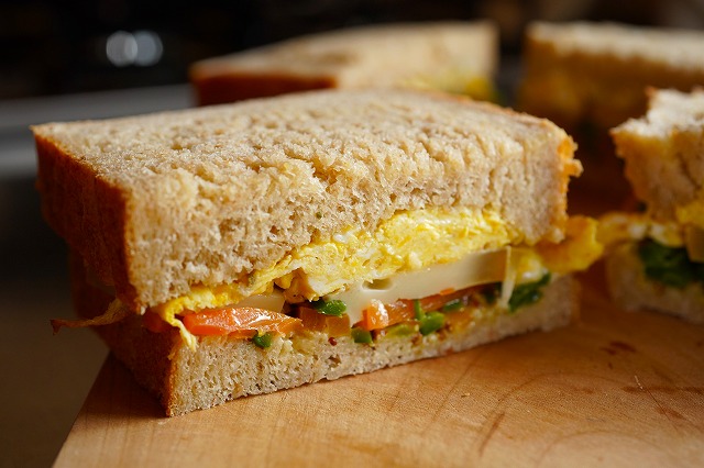 野菜、卵、チーズをたっぷり挟み、ぎゅっと押さえて完成。